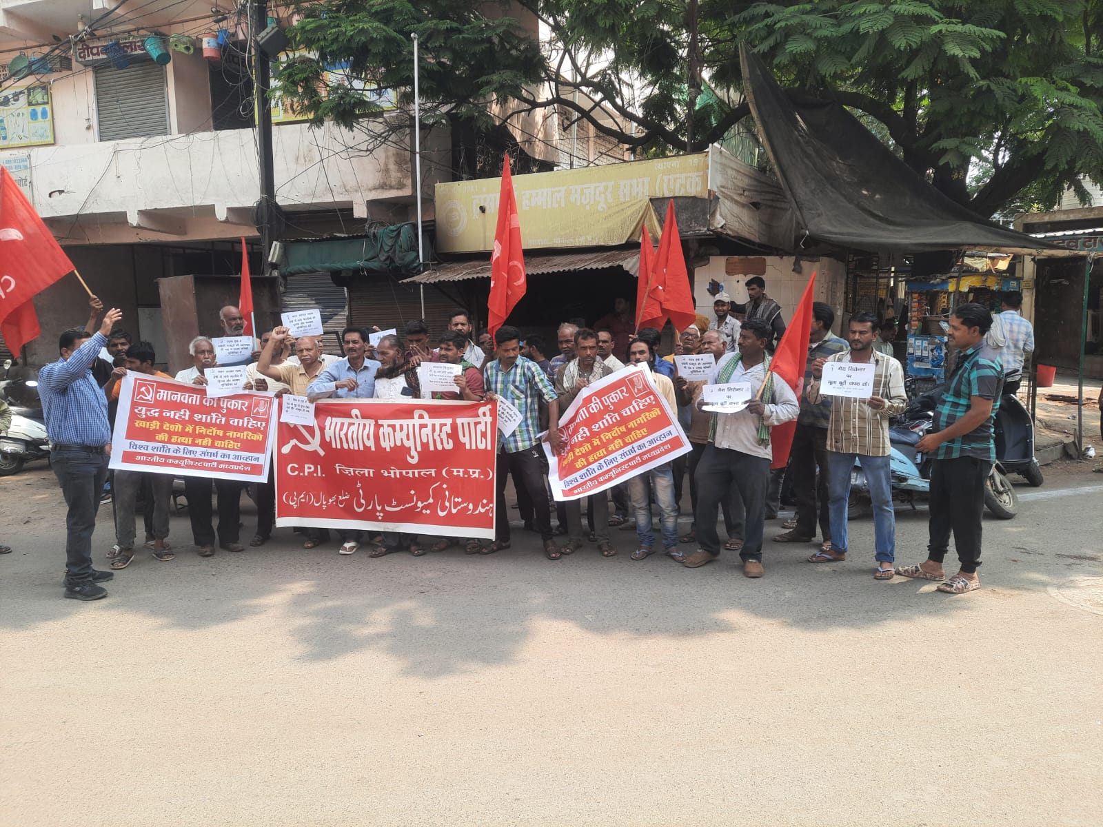 भोपाल: भारतीय कम्युनिस्ट पार्टी (भाकपा) मध्य प्रदेश के आह्वान पर भोपाल के इतवारा स्थित हम्माल मजदूर यूनियन कार्यालय के सामने एक विशाल प्रदर्शन किया गया। 'मानवता की पुकार, युद्ध नहीं शांति चाहिए' के नारे के साथ आयोजित इस प्रदर्शन में सैकड़ों की संख्या में लोगों और कार्यकर्ताओं ने भाग लिया।